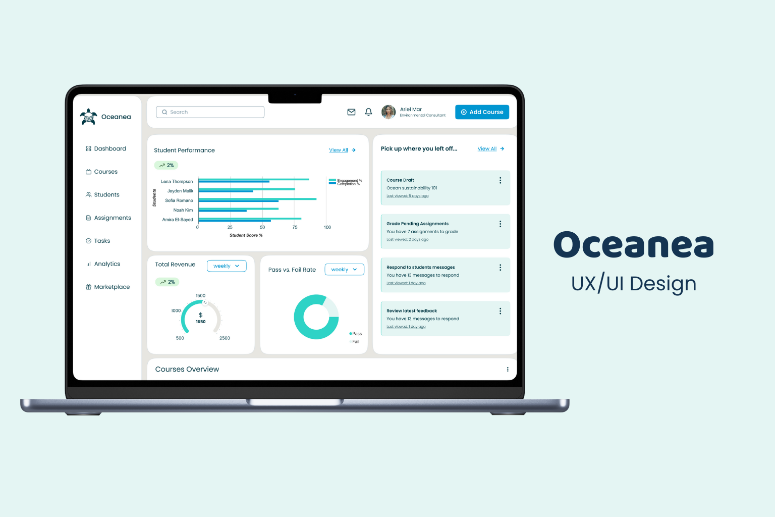 Oceanea unified dashboards and course tools into one clear system, helping environmental educators reduce manual work, track engagement, and make informed decisions—all without switching platforms.